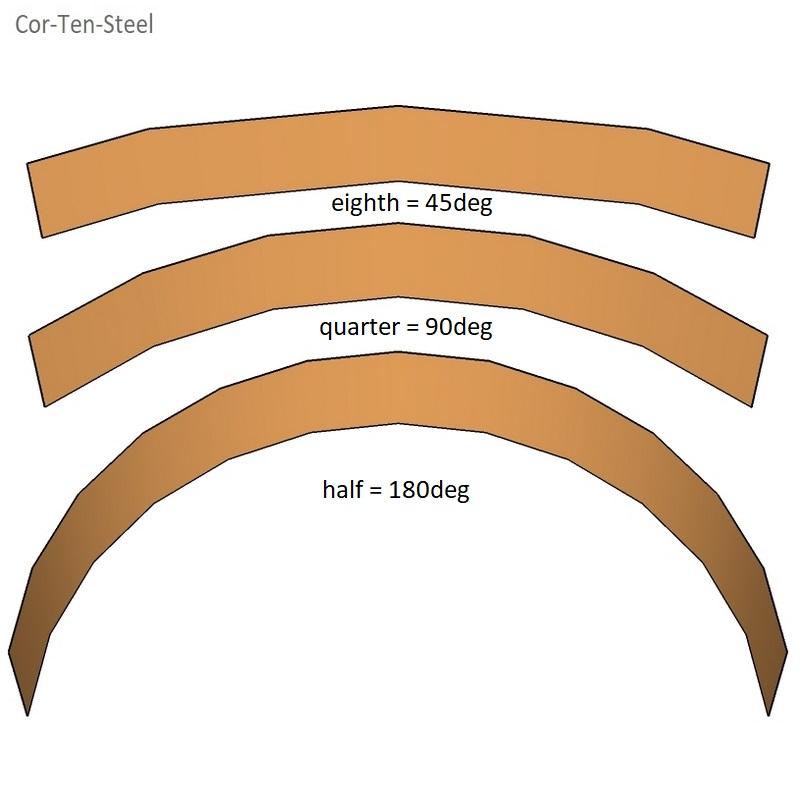 Preformed corten edging curves come in half, quarter and eighth segments
