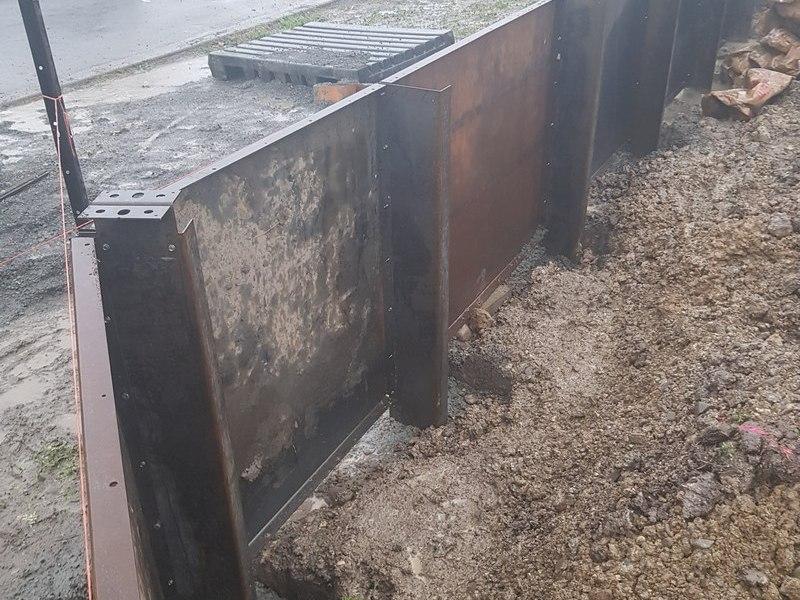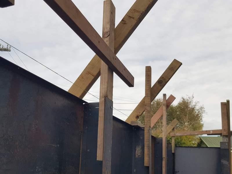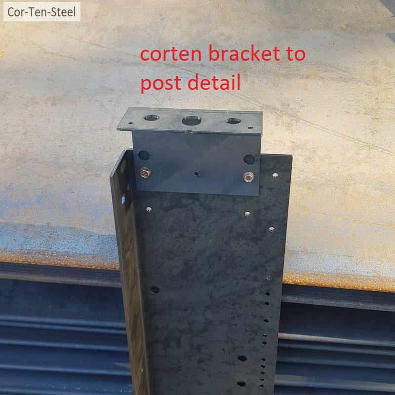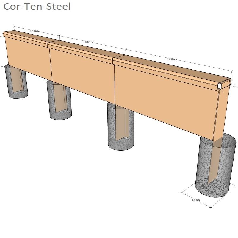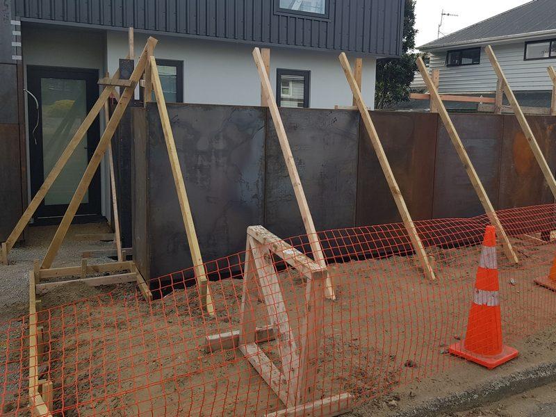 Corten support posts, with temporary timber bracing, at bottom of post. The corten steel posts have pre-drilled holes, making it easy to add the timber braces.