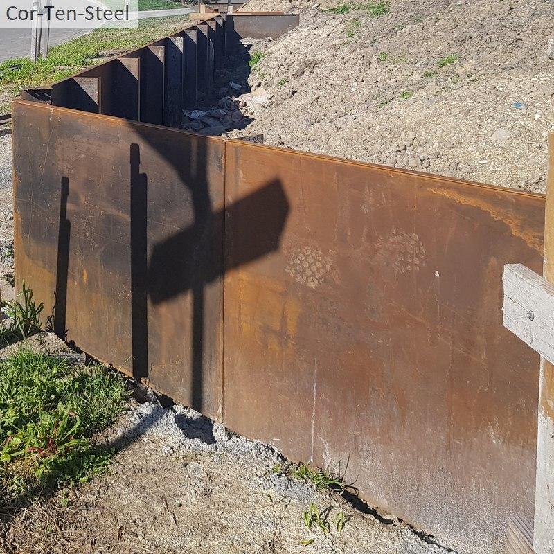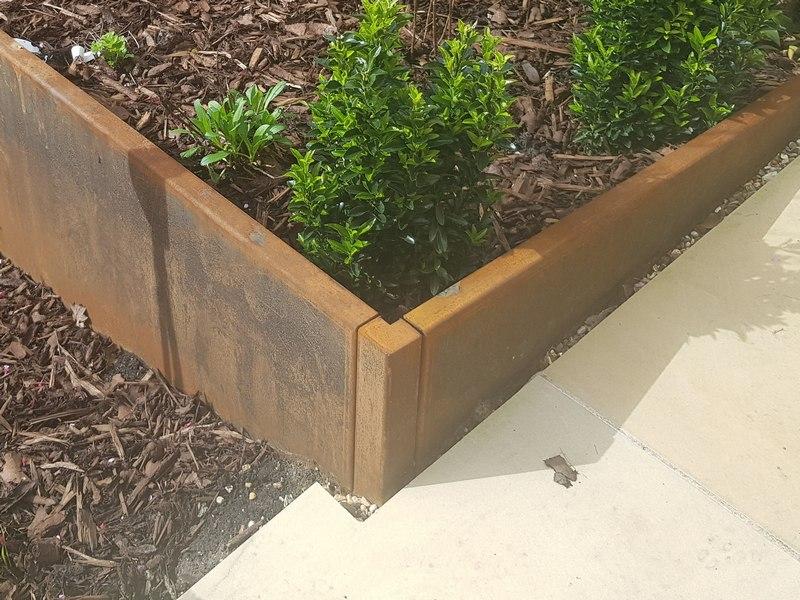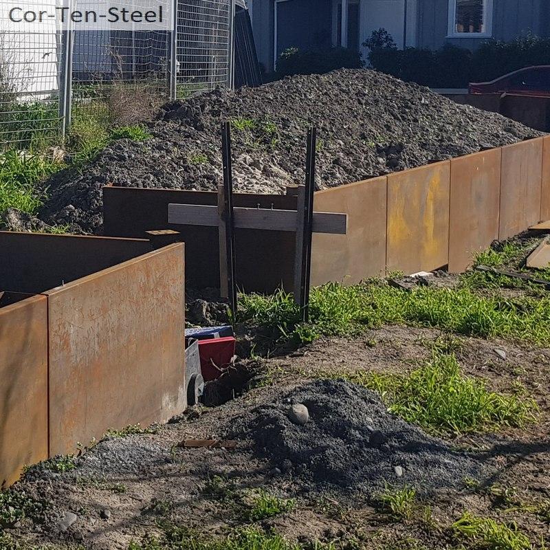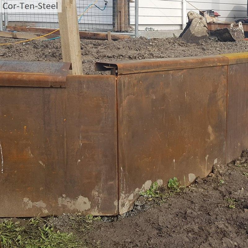 Using 1200 x 750mm tall corten retaining wall panels and hidden steel posts with 90deg corners