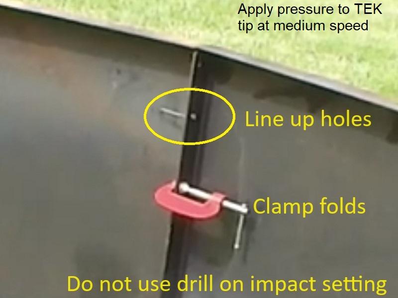 1/ Do not use drill on impact 2/ Align holes and clamp panels 3/ Apply pressure to TEK screw tip at medium speed