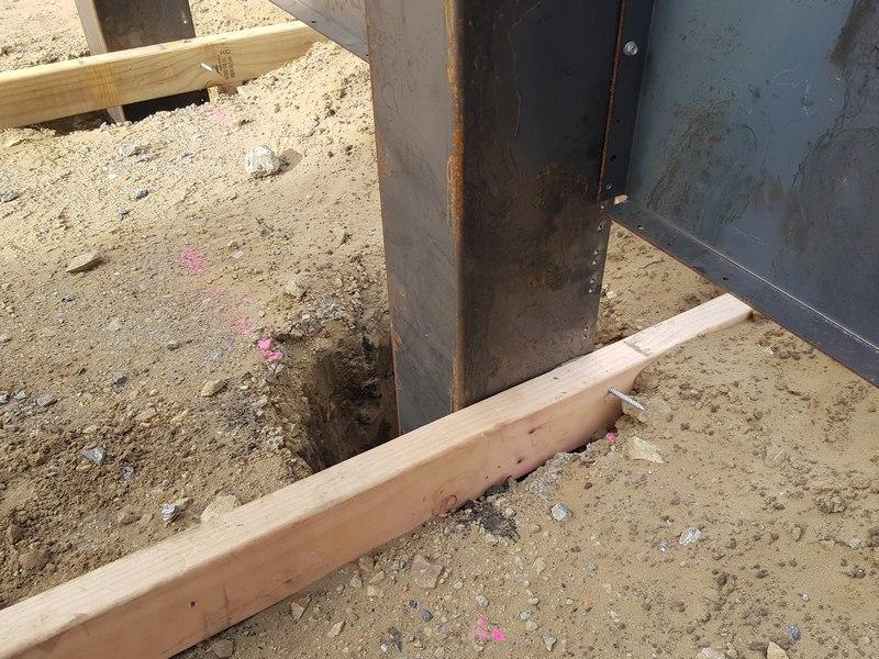 Corten support posts, with temporary timber bracing, before concrete is poured into pile holes