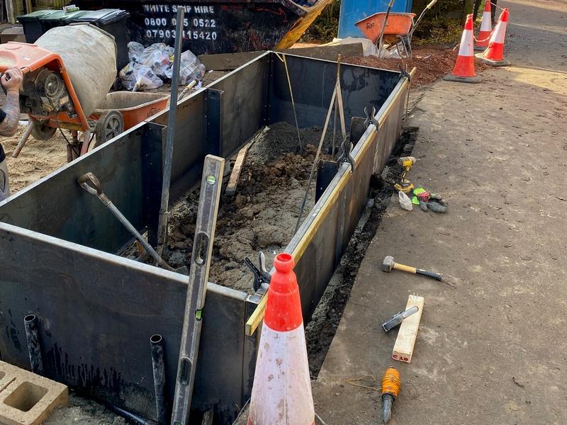 Corten support posts, with temporary timber bracing, at top of post. Remove bracing once concrete has set